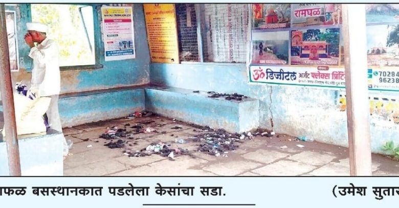 चाफळ (उमेश सुतार) : चाफळ येथील बस स्थानकामध्ये रात्री अज्ञाताने सलूनमध्ये कापलेले केस आणून टाकल्याने प्रवाशांमध्ये तीव्र संताप केला जात आहे. पोलिसांनी संबंधिताचा शोध घेऊन कडक कारवाई करावी, अशी मागणी प्रवासी वर्गातून केली जात आहे.