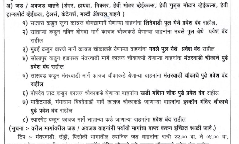 जड, अवजड वाहने डंपर, हायवा, मिक्सर, हेवी मोटर वेहिकल्स, हेवी गुड्स मोटर वेहिकल, हेवी ट्रान्सपोर्ट वेहिकल, ट्रेलर, कंटेनर्स, मल्टी एक्सेल वाहनांना पुढील प्रमाणे वाहतुकीत बदल करण्यात आलेला आहे.